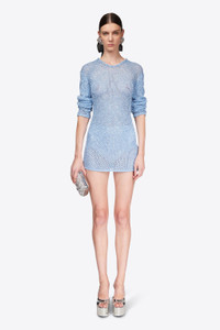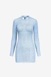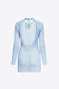 Crochet open back long sleeve mini dress featuring sequin embellishment all over. Available in Light Blue & Black. - 100% Polyamide - Dry Clean Only - Model is 5'11.5" and wears a size S