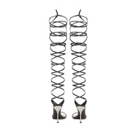 The Shibari sandals from the Sergio Rossi x Area collaboration offer showstopping sensuality. The bold design with gladiator-inspired over-the-knee crisscross laces gets a contemporary and unique denim twist. The embellished chrome heel completes the silhouette, for the woman in search of a look that matches her personality. Available in Black & Bianco. - Made in Italy - 100% Lamb Nappa - Runs half size small