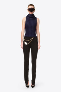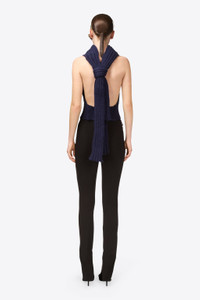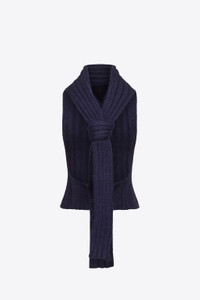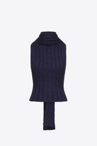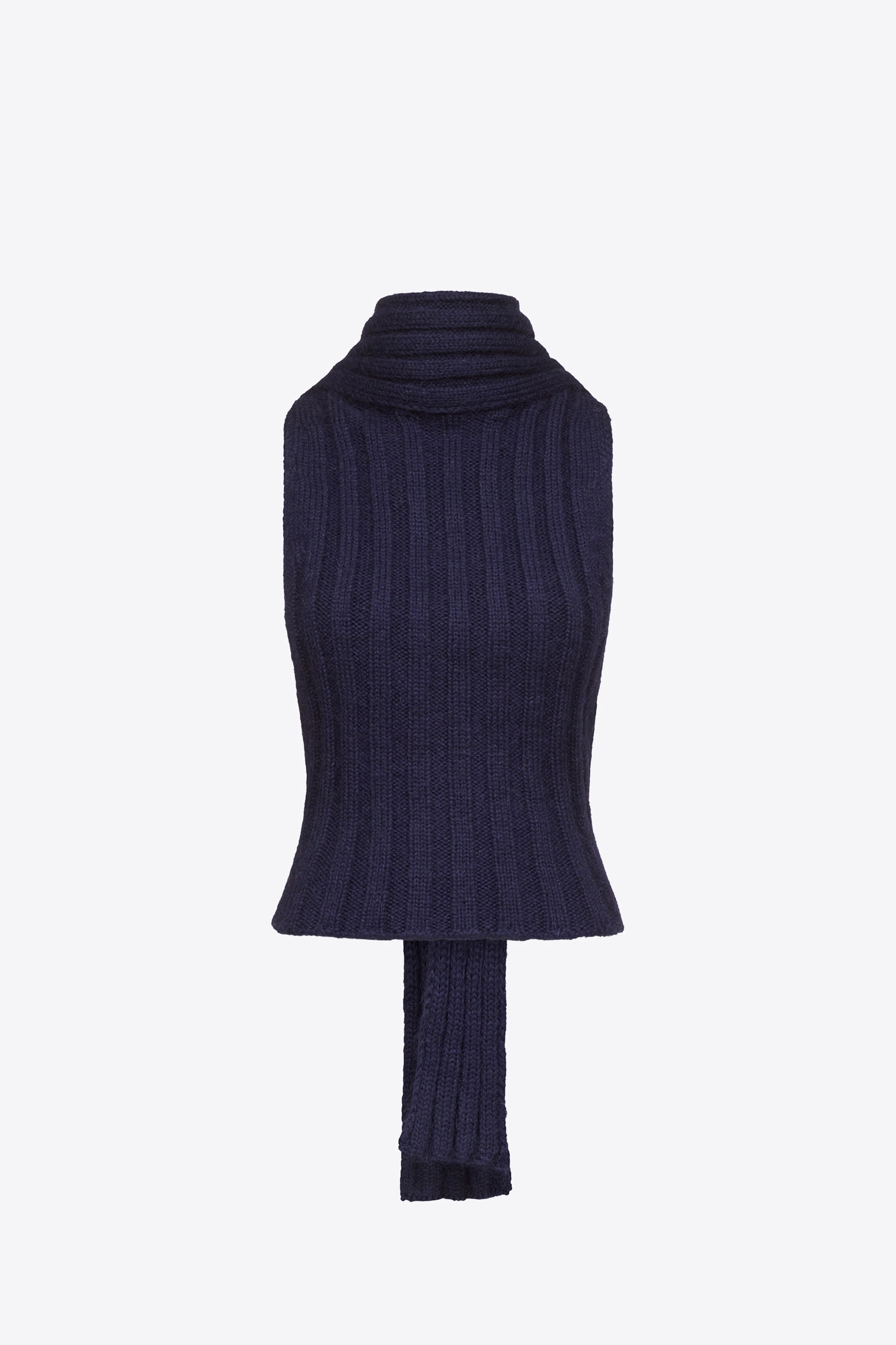 Rib knit sleeveless top featuring open back and twist knot detail at rear. Available in Midnight Blue & Light Beige. - Made in Italy - 46% Acrylic, 28% Wool Mohair, 19% Polyamide, 7% Polyester - Dry Clean Only - Model is 5'10.5" and wears a size S
