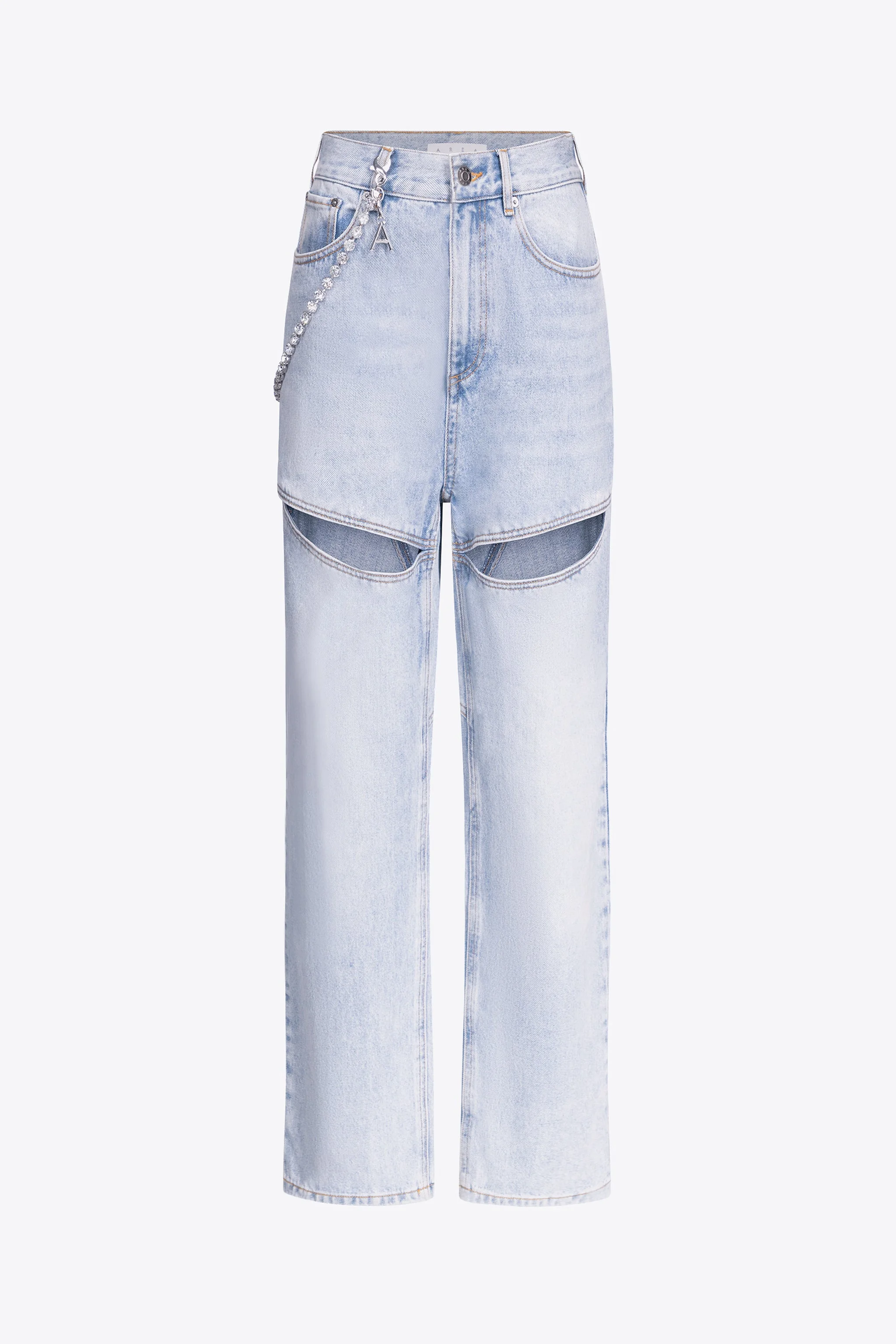 Classic denim jeans feature detachable crystal cupchain trim with "A" logo. Designed with straight leg and mid-rise for a relaxed fit. If in between sizes, we recommend you size down. Available in Light Blue & Black. - 100% Cotton - Dry Clean Only - Runs large. We recommend taking 1 size down. Model is 5'11" and wears a size 26