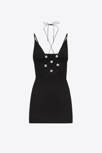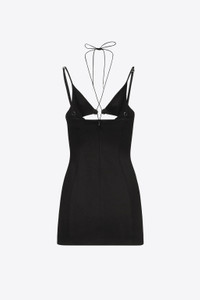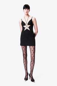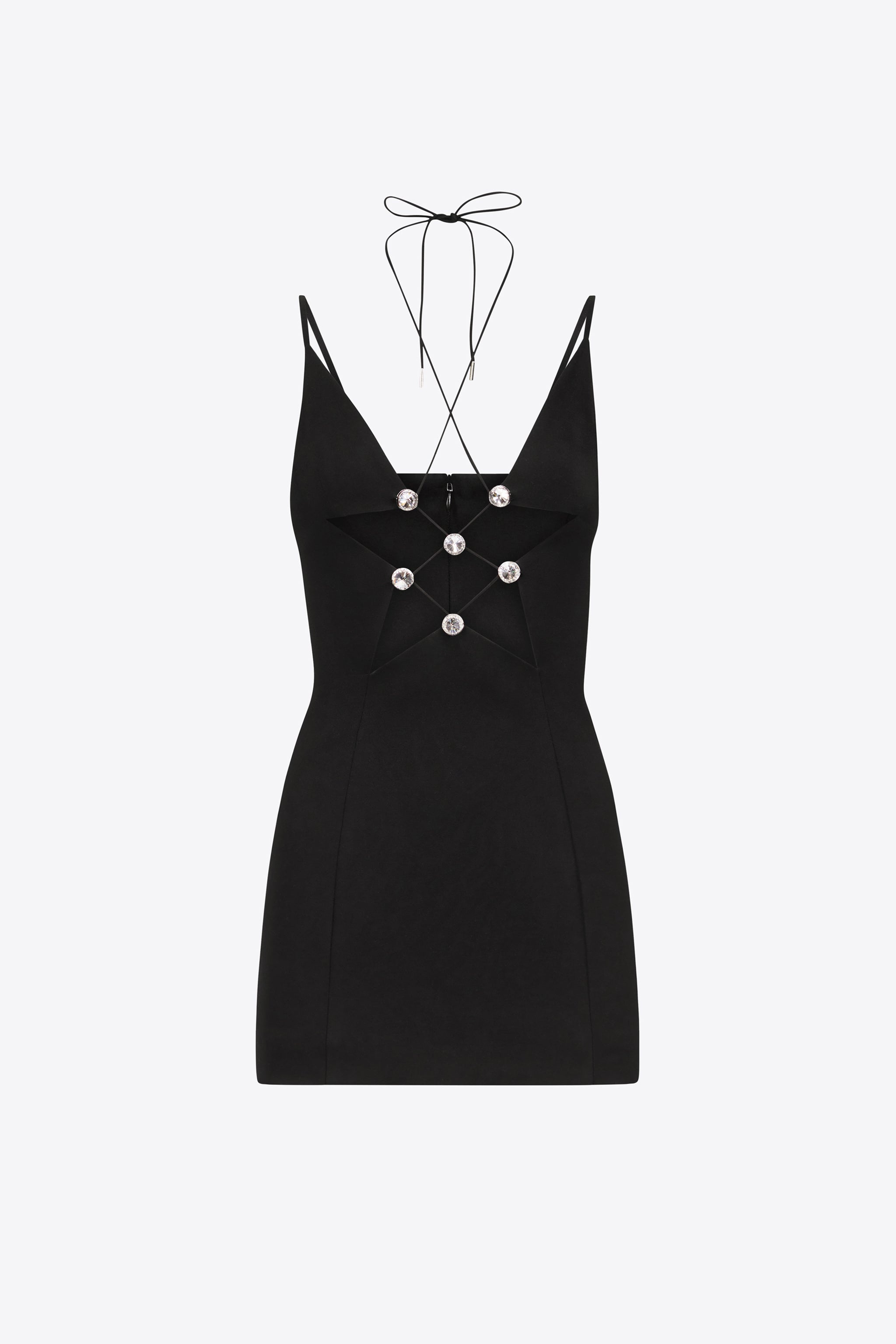 Compact Ponte Jersey mini dress featuring star cutout with crystal embellishment and adjustable shoulder straps. Available in Black ad Scarlet. - 67% Rayon, 28% Nylon, 5% Elastane - Dry Clean Only - Model is 5'10" and wears a size S