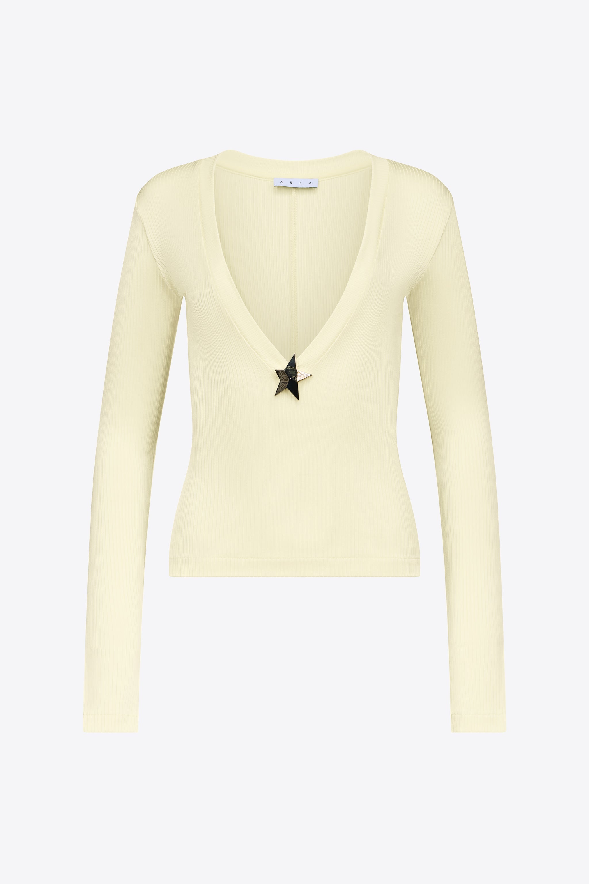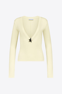 Ribbed long sleeve top featuring star stud embellishment and plunging v-neck. Available in Cream Yellow and Black. - 97% Viscose, 3% Elastane - Dry Clean Only - Model is 5'11" and wears a size S