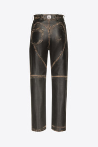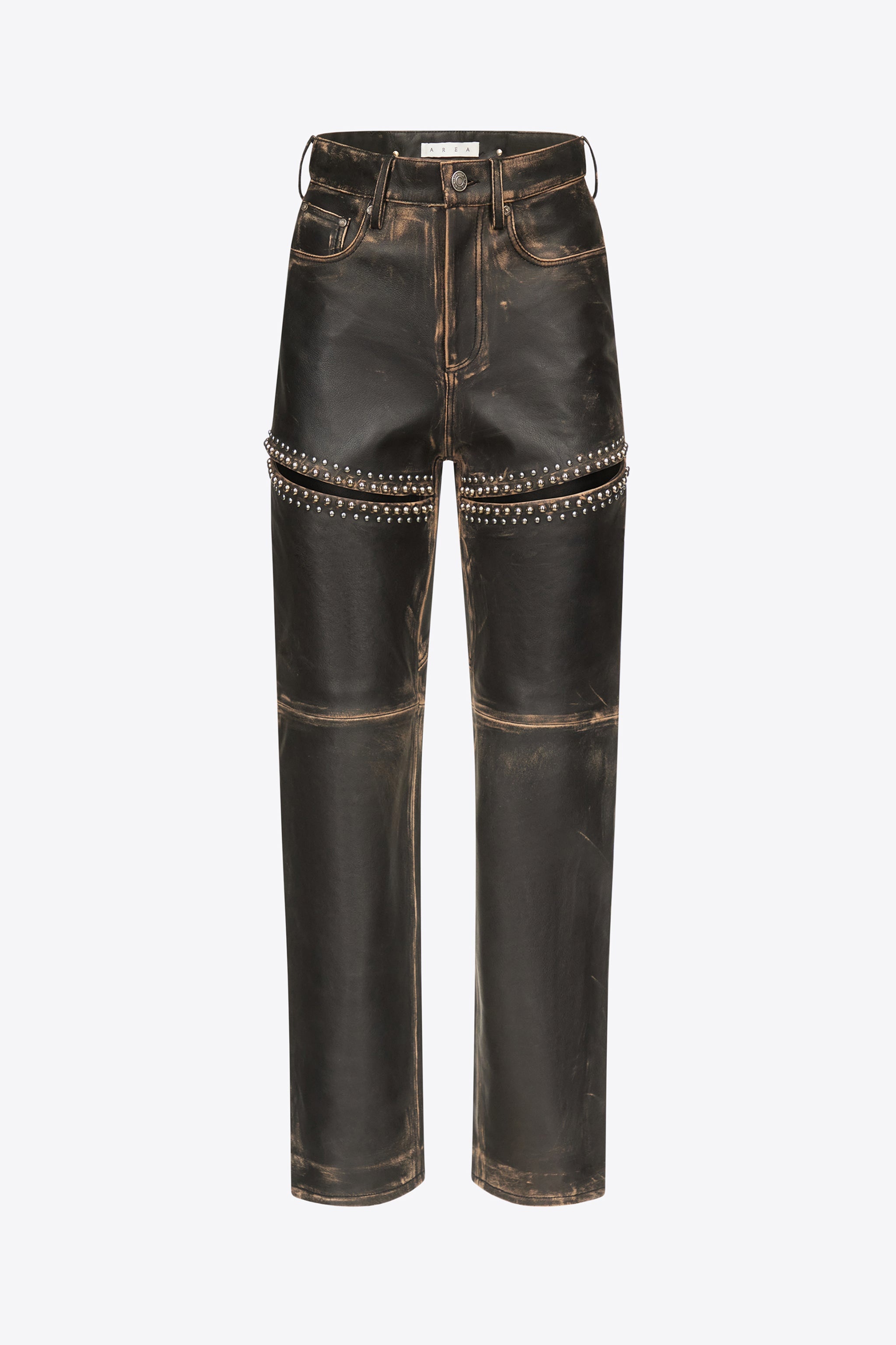 Distressed leather front slit pants. Features metal stud trim & zip / fly closure. Available in Black. - Made in India - 100% Leather - Dry Clean Only - Model is 5'9.5" and wears a size US 2