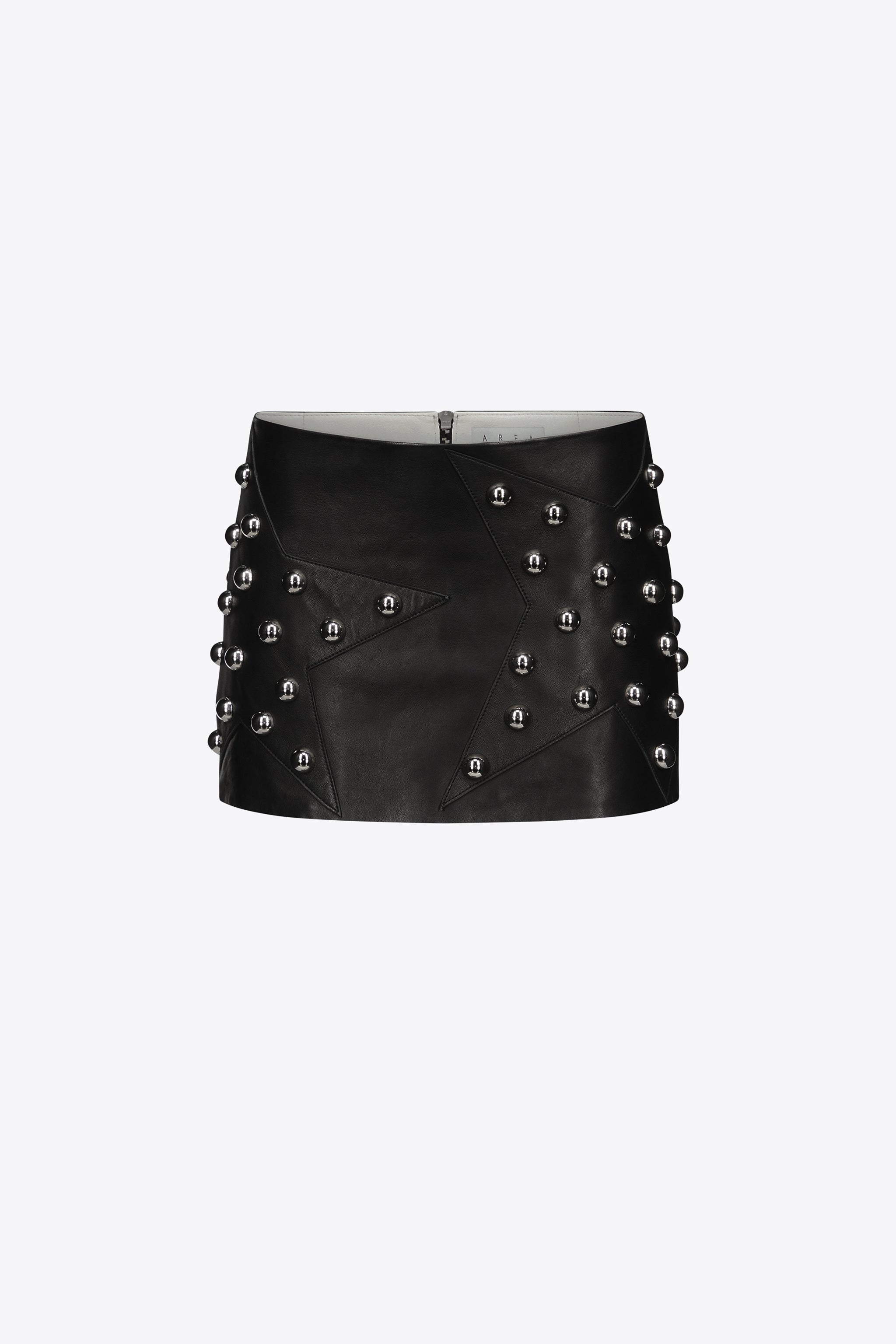 Leather mini skirt featuring star detail and silver dome studded embellishment. Available in Black. - Made in India - 100% Leather - Dry Clean Only - Model is 5'11" and wears a size US 2