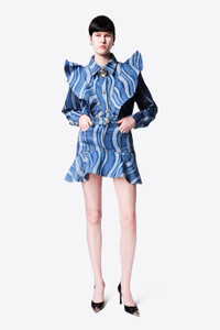 Denim long mini skirt featuring ruffle hem and crystal medallion embellishment and sunray pattern. Available in Indigo Multi. - Made in Italy - 100% Cotton - Dry Clean Only - Model is 5'11" and wears a size 26