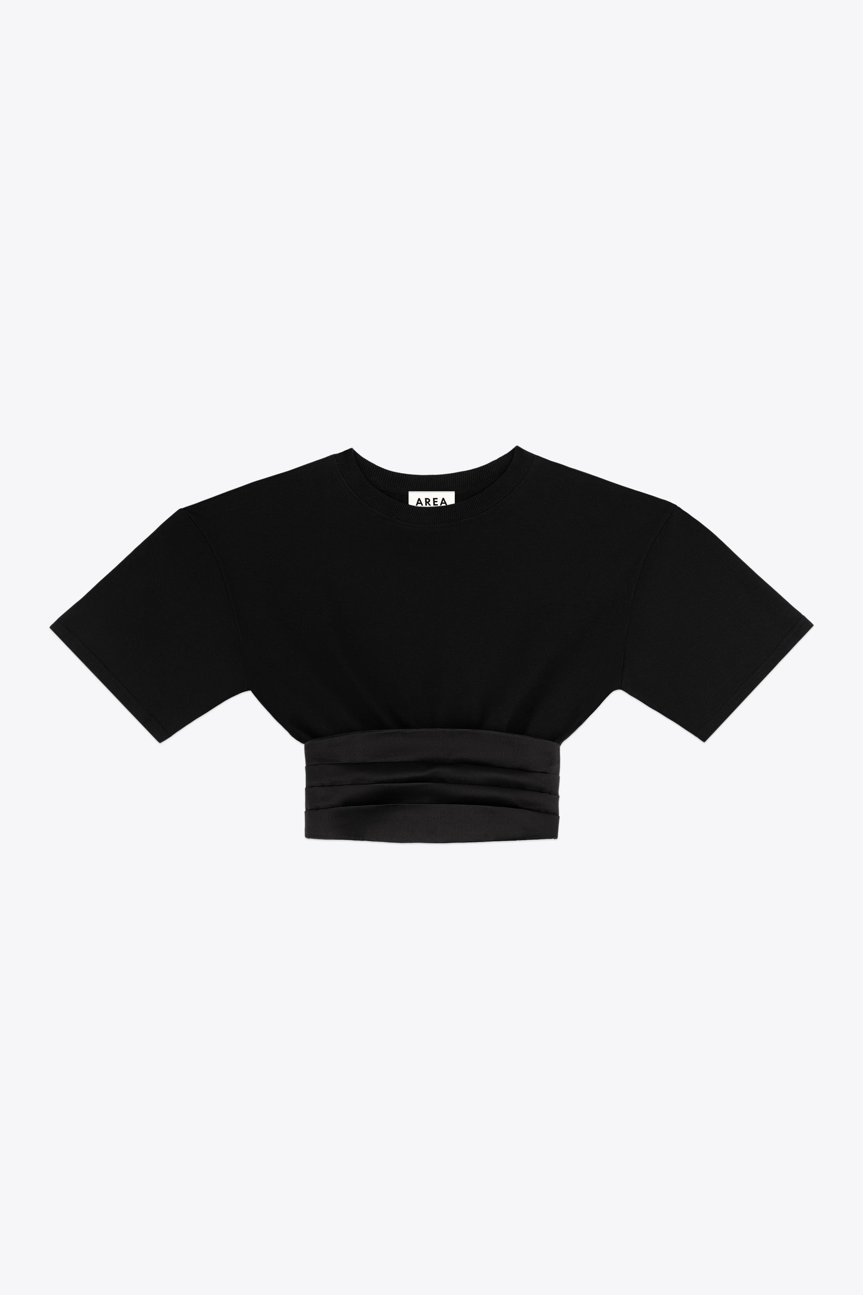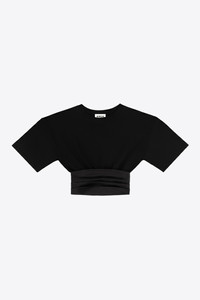 Jersey cotton t-shirt featuring satin pleated cummerbund waist with adjustable clasp. Available in Washed Black & White. - Made in Italy - 100% Cotton - Dry Clean Only - Model is 5'11" and wears a size S
