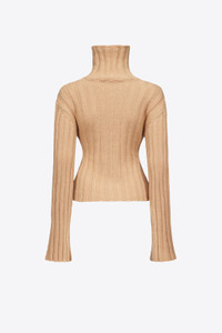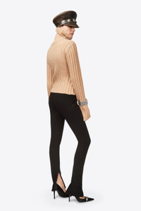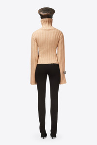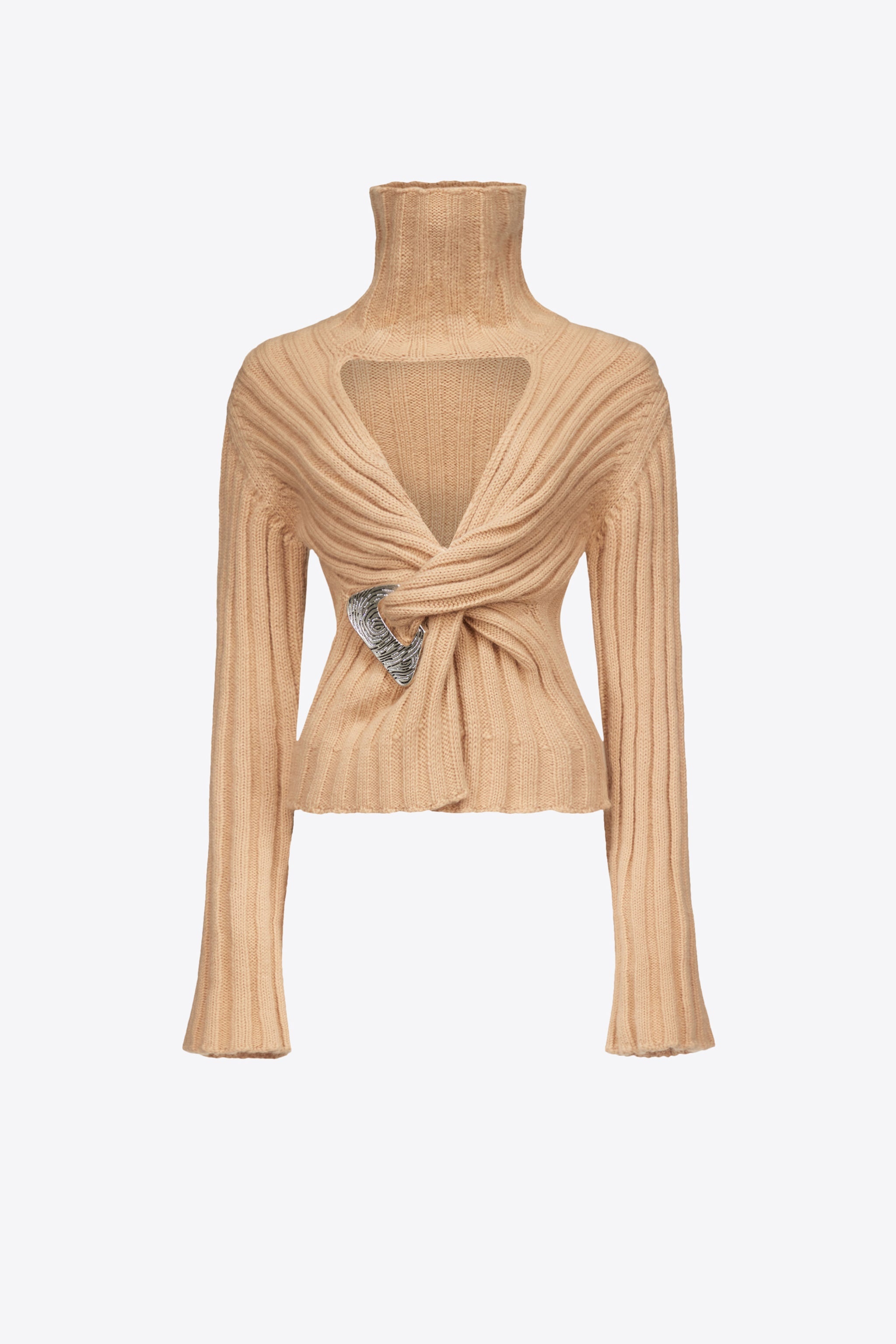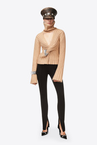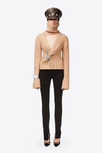 Rib knit turtle neck sweater with keyhole cutout. Features front twist detail and pave crystal embellished buckle. Available in Light Beige & Midnight Blue. - Made in Italy - 46% Acrylic, 28% Wool Mohair, 19% Polyamide, 7% Polyester - Dry Clean Only - Model is 5'9.5" and wears a size S