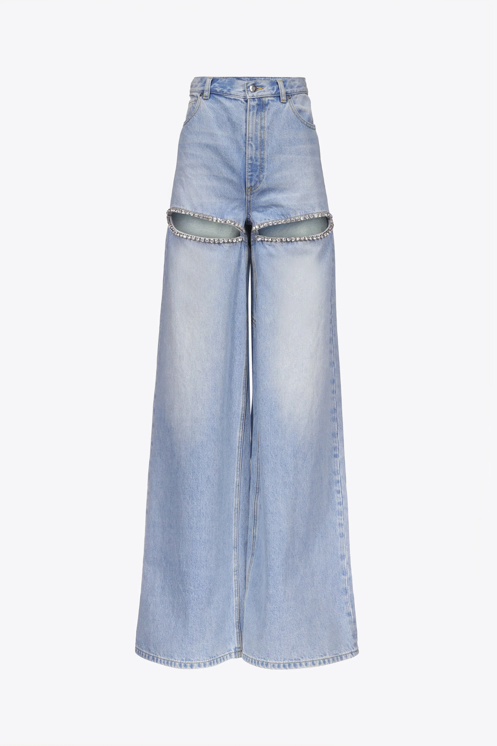 Classic denim wide-leg jeans featuring crystal cupchain trim slits at thighs. Available in Light Blue. - 100% Cotton - Dry Clean Only - Model is 5'10" and wears a size US 26