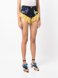 wool-trim denim shorts indigo blue mohair-cotton blend fur-textured trim embroidered design belt loops front button and zip fastening rear patch pocket Imported Composition Body: Cotton 100% Trims: Mohair 79%, Cotton 21% SIZE & FIT Model measurements Height 5 ft 10 in(1.77 m) Bust/Chest 31.49 in(80 cm) Hips 35.43 in(90 cm) Waist 25.19 in(64 cm) Measurement FRONT RISE 11.02 in(28 cm) HIPS 32.28 in(82 cm) FittingInformation This piece fits true to size. We recommend you get your regular size Cut for a close fit Made with a mid-weight fabric Washing instructions Dry Clean Only
