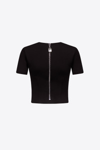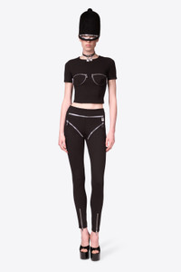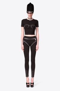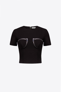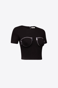 Compact ponte jersey bustier cup t-shirt. Features zipper trim detail at cups and back zipper closure. Available in Black, Carmine & White. - 67% Rayon, 28% Nylon, 5% Elastane - Dry Clean Only - Model is 5'11" and wears a size S
