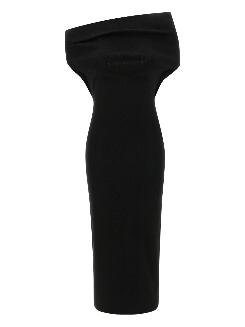 off-shoulder ribbed-knit midi dress Highlights - Black - Off-the-shoulder neckline - Short sleeves - Ribbed knit Made in Italy Composition Viscose 56%, Nylon 39%, Lycra 5% Washing instructions Read Manufacturer Guidelines