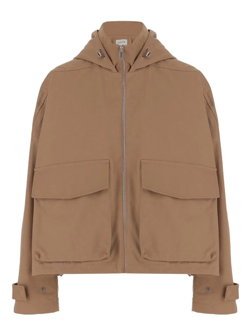 high-collar patch-pocket hooded jacket Highlights - Ochre - Adjustable hood - Drawstring hood fastening - Long sleeves - Adjustable cuffs - Two patch pockets - Front zip closure Made in Italy Composition Cotton 100% Washing instructions Read Manufacturer Guidelines