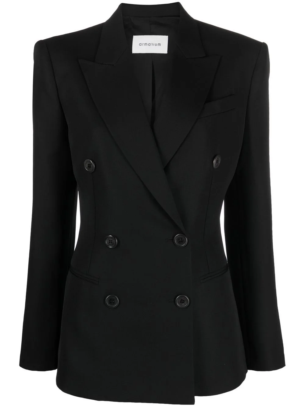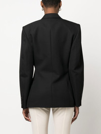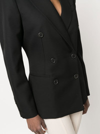 Myra double-breasted wool blazer black virgin wool V-neck shoulder pads peak lapels double-breasted button fastening fitted waistline long sleeves buttoned cuffs chest welt pocket two front jetted pockets Made in Italy Composition Outer: Virgin Wool 100% Lining: Cupro 100% SIZE & FIT Model measurements Height 5 ft 11 in(1.8 m) Bust/Chest 31.49 in(80 cm) Hips 36.61 in(93 cm) Waist 24.4 in(62 cm) FittingInformation This piece fits true to size. We recommend you get your regular size Cut for a slim fit Made with a mid-weight non-stretch fabric Washing instructions Dry Clean Only