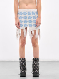 ASHLEY WILLIAMS skirt in blue & white, cotton-nylon blend, paneled knit construction, graphic jacquard knit construction, fitted waistband, distressed & fringed hem, mini-length, slim fit. Made in China 63% Cotton 35% Polyamide 2% Elastane Standard Sizing Model is 5'8" wearing size S. Bust: 32" Waist: 24" Hips: 33"