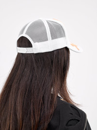 ASHLEY WILLIAMS hat in white, trucker hat design, paneled poly construction, graphic print & bandage detailing, back mesh paneling, curved brim, brim tonal topstitching, back snap-button fastening, adjustable fit. Made in Myanmar 100% Polyester One Size