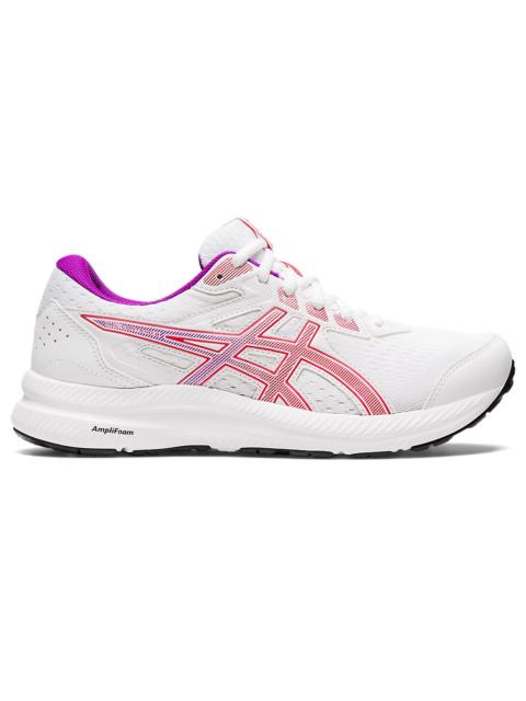 The GEL-CONTEND® 8 running shoe provides good cushioning, support, and durability. A jacquard mesh upper stretches with the foot's natural motion and creates a comfortable fit. Meanwhile, the synthetic stitching on the overlays helps create a more supportive foothold. The midsole features GEL® technology and AMPLIFOAM™ cushioning. These technologies help increase durability while creating a softer feel underfoot. Style #: 1012B320.013 UPC #: 197298132558 Tech & Materials Rearfoot GEL® technology cushioning improves impact absorption and creates a softer feeling at footstrike Jacquard mesh upper improves airflow OrthoLite™ sockliner offers excellent step-in comfort Flex grooves in the outsole improve flexibility Synthetic stitching on the overlays improves support AMPLIFOAM™ cushioning helps improve durability GUIDANCE LINE® technology provides a more consistent stride At least 20% of the shoe’s main upper material is made with recycled materials to reduce waste and carbon emissions The sockliner is produced with the solution dyeing process that reduces water usage by approximately 33% and carbon emissions by approximately 45% compared to the conventional dyeing technology