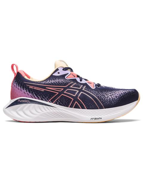 Experience a softer feel underfoot with the GEL-CUMULUS® 25 shoe. This neutral everyday trainer is a versatile choice for various running workouts and distances. We've updated the midsole with our new PureGEL® technology and FF BLAST™ PLUS cushioning. These materials help create softer landings and a more energized toe-off during your training. Style #: 1012B441.400 UPC #: 196074643172 Tech & Materials FF BLAST™ PLUS technology Cushioning provides lightweight impact absorption and a responsive rebound PureGEL® technology . Helps provide lightweight cushioning and softer landings Engineered jacquard mesh upper Helps improve breathability and comfort The sockliner is produced with the solution dyeing process that reduces water usage by approximately 33% and carbon emissions by approximately 45% compared to the conventional dyeing technology Reflective details Designed to improve visibility in low-light conditions At least 75% of the shoe's main upper material is made with recycled content to reduce waste and carbon emissions OrthoLite™ X-30 sockliner Provides soft step-in comfort Full-ground contact design Creates a smoother and more efficient ride AHAR® outsole rubber Improves durability