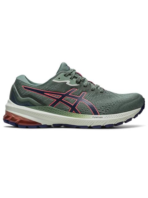 Our key focus for the GT-1000™ 11 TR shoe was to make it softer and smoother. Part of our NATURE BATHING™ Collection, this shoe is inspired by the Japanese phrase, "shirin yoku." Its colorway draws inspiration from the calming hues found in nature. Meanwhile, its trail-specific outsole is functional for running on off-road surfaces. FLYTEFOAM® cushioning in the midsole is tuned with a lower density than the previous version. Teamed with GEL® technology, this combination creates softer landings and smoother transitions. LITETRUSS™ technology is placed on the midsole’s inside angle to reduce pronation. It helps produce a more supportive stride while keeping overpronation at bay. Style #: 1012B388.001 UPC #: 196074350001 Tech & Materials Engineered mesh upper Improves breathability and wraps the foot with a soft feel. AHARPLUS™ heel plug Improves durability. Trail-specific outsole External heel counter Improves the fit and helps increase stability. LITETRUSS™ technology Improves medial support and midfoot integrity. FLYTEFOAM™ cushioning Provides lightweight impact absorption. Rearfoot GEL™ technology Improves impact absorption and creates a softer feeling at footstrike. OrthoLite™ X-30 sockliner Provides soft step-in comfort. Reflective details Help improve visibility in low-light settings. Approx. 75% of the upper's material is made with recycled polyester The sockliner is produced with the solution dyeing process that reduces water usage by approximately