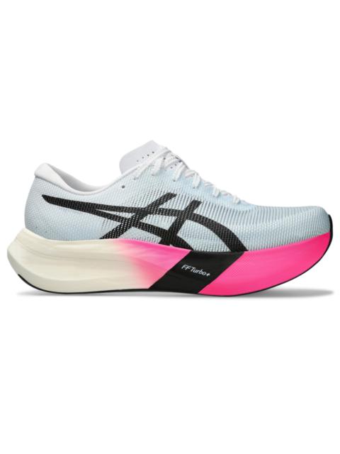 The METASPEED™ EDGE PARIS racing shoes are designed for cadence-style runners who are looking to start fast and finish faster. Runners wearing these shoes will be able to increase their speed by increasing number of strides and conserve energy with each step. Thanks to an energetic midsole foam and a propulsive carbon plate, runners wearing these shoes will be able to conserve more energy while maintaining their pace at the later stages of the race. This update will also help you to kick-through the 30km wall more easily. In addition to its lighter construction, these shoes also feature FF TURBO™ PLUS cushioning. This helps to improve compression and while providing more energy savings. Style #: 1013A124.400 UPC #: None Tech & Materials MOTION WRAP™ 2.0 upper is designed to improve breathability and comfort FF TURBO™ PLUS cushioning Improves compression and helps provide more energy savings Curved sole design Helps runners conserve more energy in each step Carbon plate Guides your foot throughout your step and propels your foot forward ASICSGRIP™ outsole rubber Provides advanced grip for various terrains At least 50% of the shoe's main upper material is made with recycled content to reduce waste and carbon emissions The sockliner is produced with the solution dyeing process that reduces water usage by approximately 33% and carbon emissions by approximately 45% compared to the conventional dyeing technology