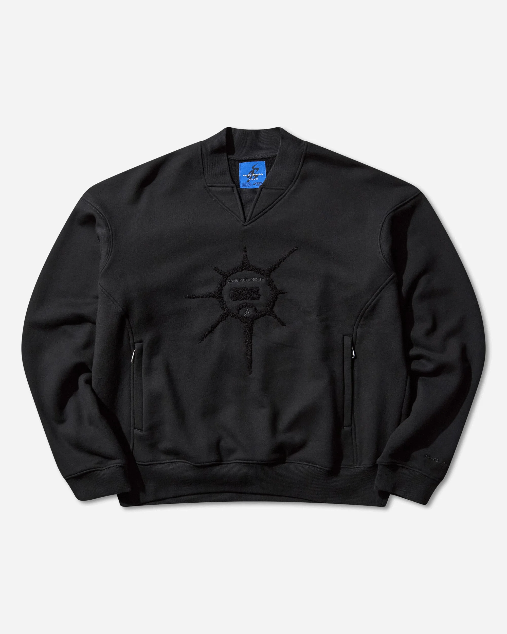Asics Novalis Pyroloi Sweatshirt Black The PYROLOI Sweatshirt features a minimalist silhouette with a polo-style neckline. Designed with a double rib contrast collar, panel detailing, and cover-stitched seams, it includes boucle chenille embroidery combining the ASICS logo with the Novalis Humanoid. Zipped pockets with custom pullers and back embroidery complete the piece. Made from Japanese cotton jersey. - 98% Cotton, 2% Elastane - Relaxed Fit - Double-Rib Contrast Collar - Panel Detailing - Cover-Stitched Seams - Boucle Chenille Embroidery - Two Side Zip Pockets - Ribbed Cuffs and Hem - Style Code: 2203A327-001