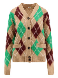 argyle-pattern wool cardigan Highlights - Camel brown - Argyle pattern - V-neck - Front button fastening - Two front pockets - Ribbed hem Imported Composition Wool 100% Washing instructions Read Manufacturer Guidelines