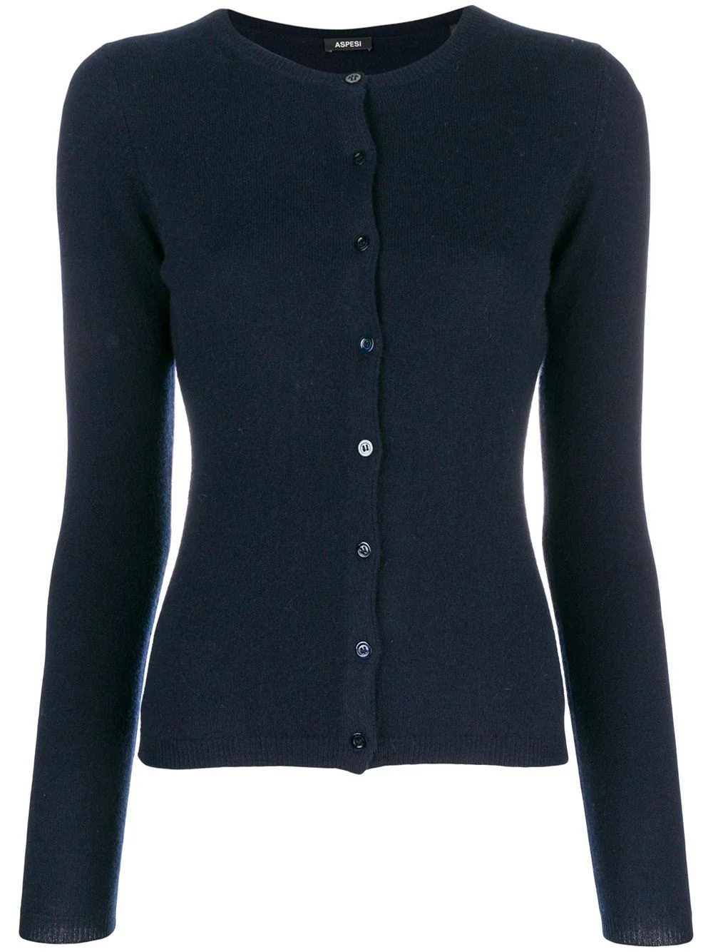 cashmere fitted cardigan Navy blue cashmere fitted cardigan from Aspesi. Imported Composition Cashmere 100% Washing instructions Hand Wash