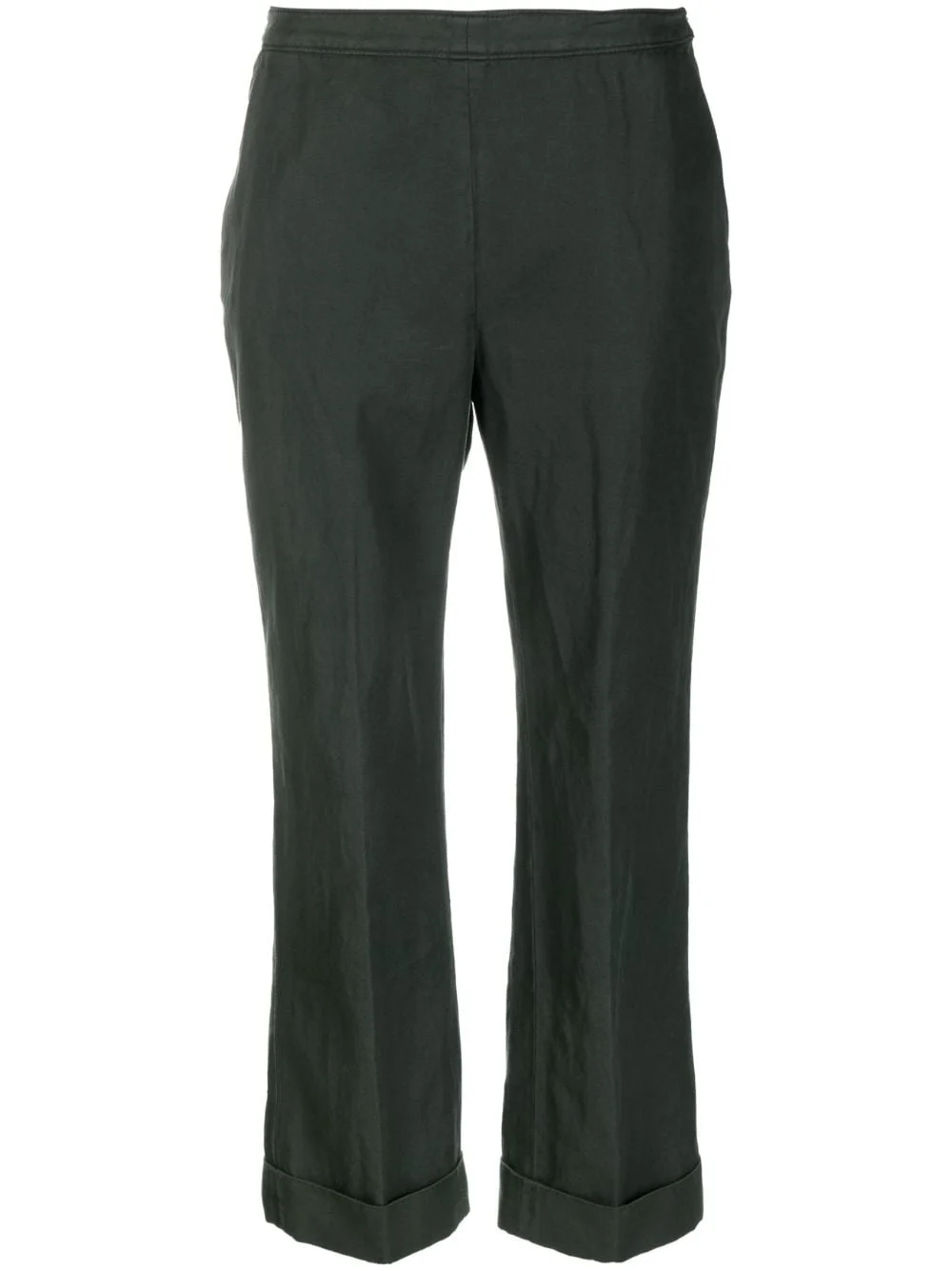cropped flared trousers Highlights - Dark grey - Cotton-linen blend - Flared design - Mid-rise - Two side inset pockets - Two rear button-fastening jetted pockets - Cropped leg - Turn-up hem Imported Composition Cotton 61%, Linen/Flax 39% SIZE & FIT Model measurements Height 5 ft 11 in(1.8 m) Bust/Chest 33.07 in(84 cm) Hips 37.4 in(95 cm) Waist 25.19 in(64 cm) FittingInformation Designed with a flared hem, these trousers allow for a close fit at the waist with a slim fit over the leg and widening towards the hem