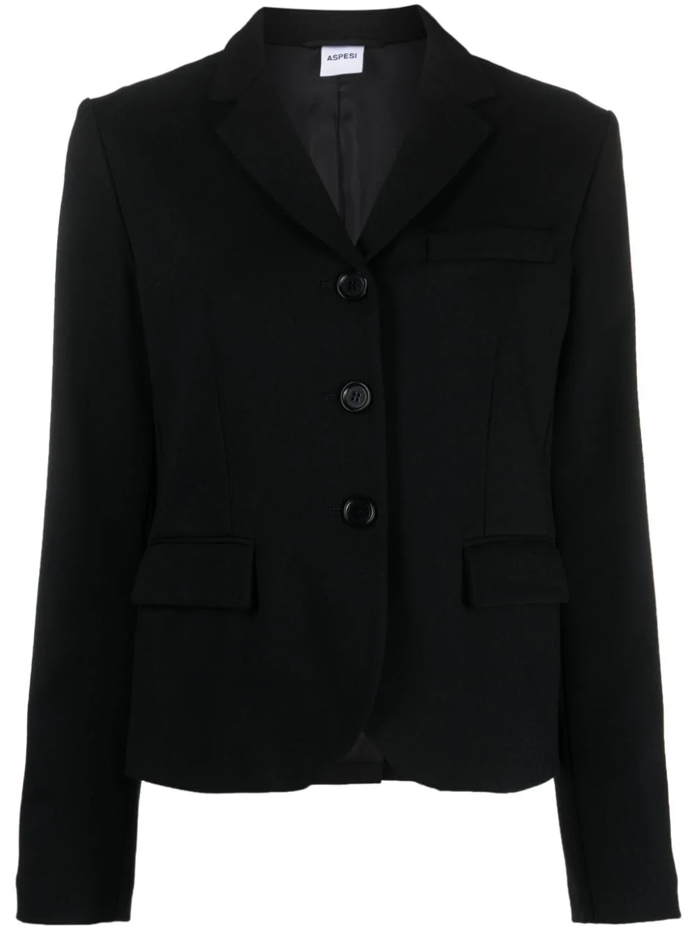 cropped three-button blazer Highlights - Black - Notched lapels - Chest welt pocket - Front button fastening - Two front flap pockets - Buttoned-cuff sleeves - Cropped shape - Curved front hem - Straight rear hem - Rear slit Made in Italy Composition Outer: Viscose 69%, Polyamide 25%, Spandex/Elastane 6% Lining: Viscose 100% SIZE & FIT Model measurements Height 5 ft 10 in(1.77 m) Bust/Chest 31.88 in(81 cm) Hips 36.22 in(92 cm) Waist 24.01 in(61 cm) FittingInformation Designed for a slim fit that sits just away from the body offering a close yet comfortable fit Made from a midweight fabric This piece fits true to size – take your usual size