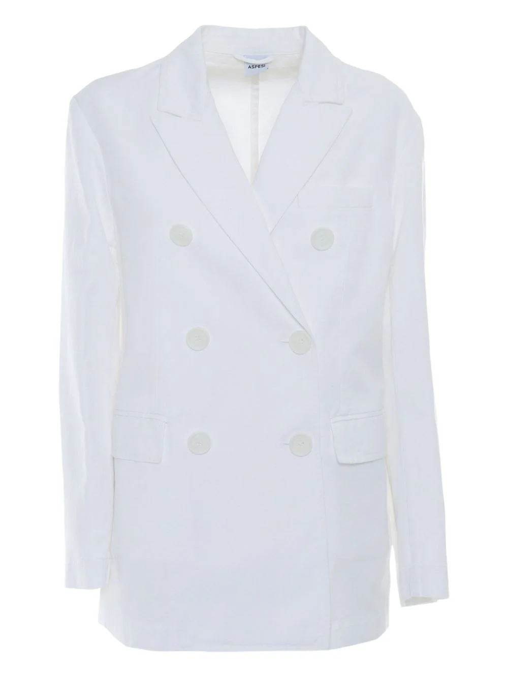 double-breasted cotton linen blazer Highlights - White - Cotton-linen blend - Double-breasted closure - Four buttons - Notched lapel - Flap pockets Made in Italy Composition Cotton 58%, Linen/Flax 42% Washing instructions Read Manufacturer Guidelines