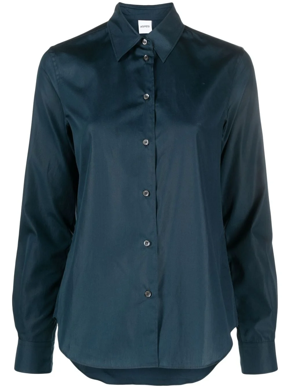 long-sleeved button-up shirt Highlights - Navy blue - Cotton - Poplin texture - Buttoned cuffs - Spread collar - Front button fastening - Long sleeves - Curved hem Imported Composition Cotton 100% SIZE & FIT Model measurements Height 5 ft 10 in(1.78 m) Bust/Chest 33.46 in(85 cm) Hips 36.22 in(92 cm) Waist 23.22 in(59 cm) FittingInformation Designed to be unstructured, offering a loose fit throughout Made from a midweight non-stretch fabric This piece fits true to size – take your usual size Washing instructions Machine Wash