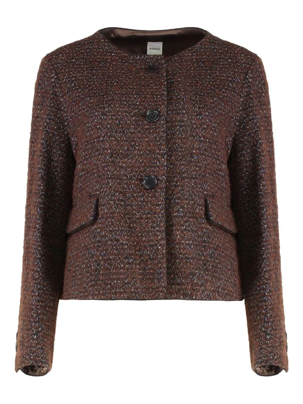 melange-effect jacket Highlights - Brown - Round neck - Front button fastening - Long sleeves - Two front flap pockets - Textured finish Made in Italy Composition Modacrylic 30%, Cotton 26%, Polyester 10%, Virgin Wool 8%, Alpaca Wool 8%, Wool 8%, Polyamide 5%, Other Materials 5% Washing instructions Read Manufacturer Guidelines