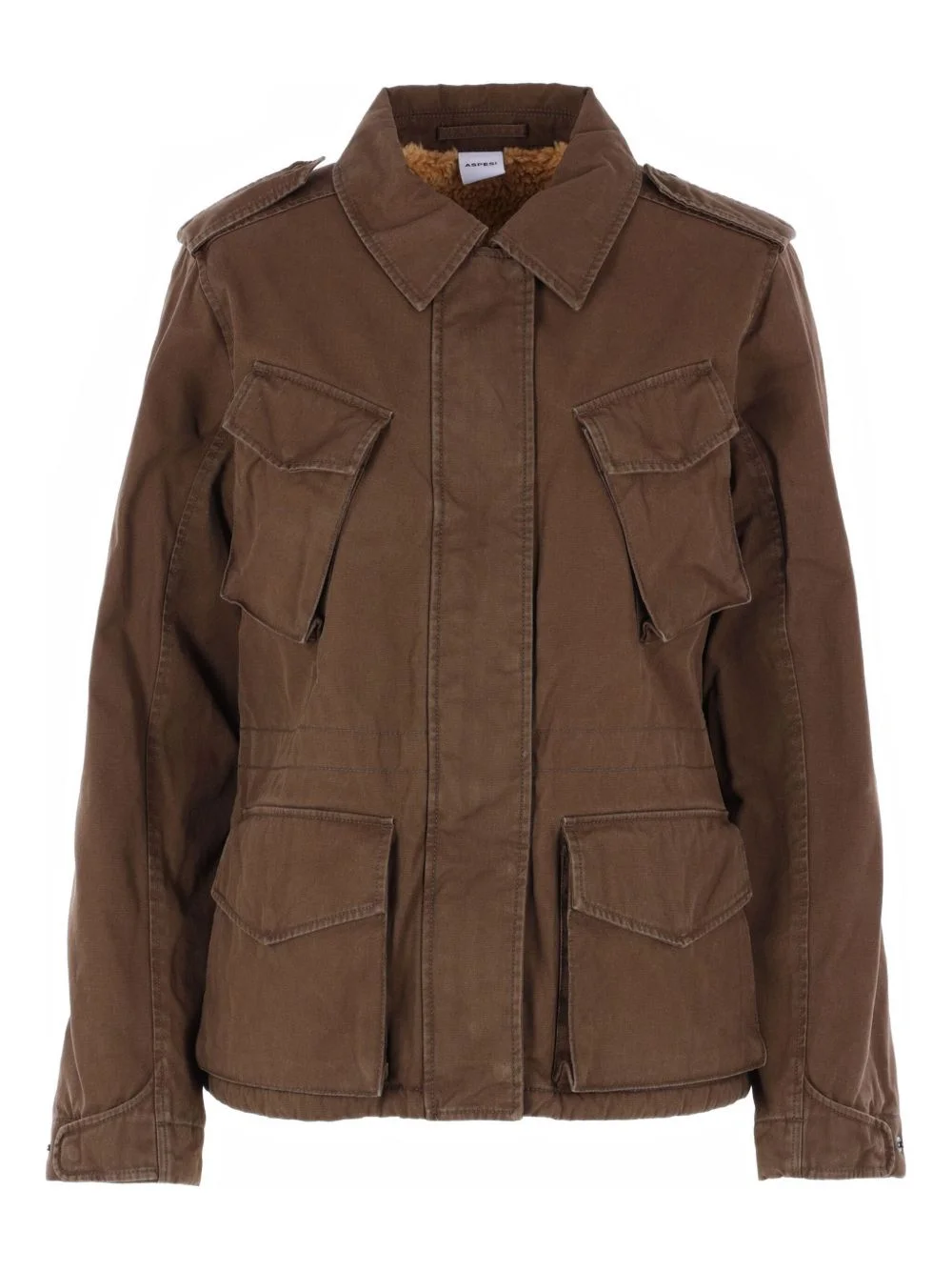pocketed collared military jacket Highlights - Brown - Collared - Front pockets - Shoulder epaulettes - Long sleeves Imported Composition Fabric 100% Washing instructions Read Manufacturer Guidelines