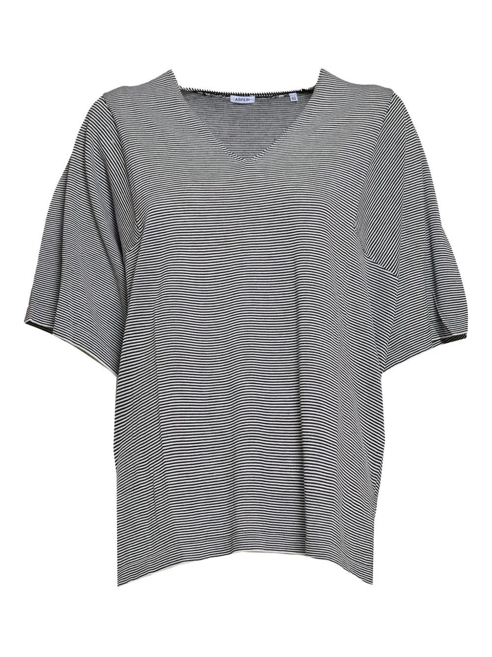 V-neck T-shirt Highlights - Black - Short sleeves - Straight hem - Horizontal stripe pattern Imported Composition Cotton 85%, Linen/Flax 10%, Silk 5% Washing instructions Read Manufacturer Guidelines