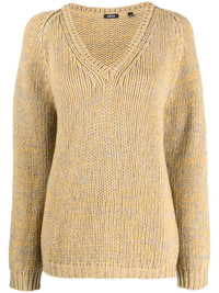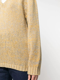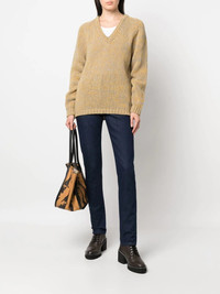virgin wool V-neck jumper mustard yellow virgin wool V-neck chunky knit long sleeves ribbed trim Made in Italy Composition Virgin Wool 100% SIZE & FIT Model measurements Height 5 ft 10 in(1.78 m) Bust/Chest 31.49 in(80 cm) Hips 36.22 in(92 cm) Waist 25.59 in(65 cm) FittingInformation This piece fits true to size. We recommend you get your regular size Cut for a loose fit Made with a mid-weight fabric Washing instructions Hand Wash