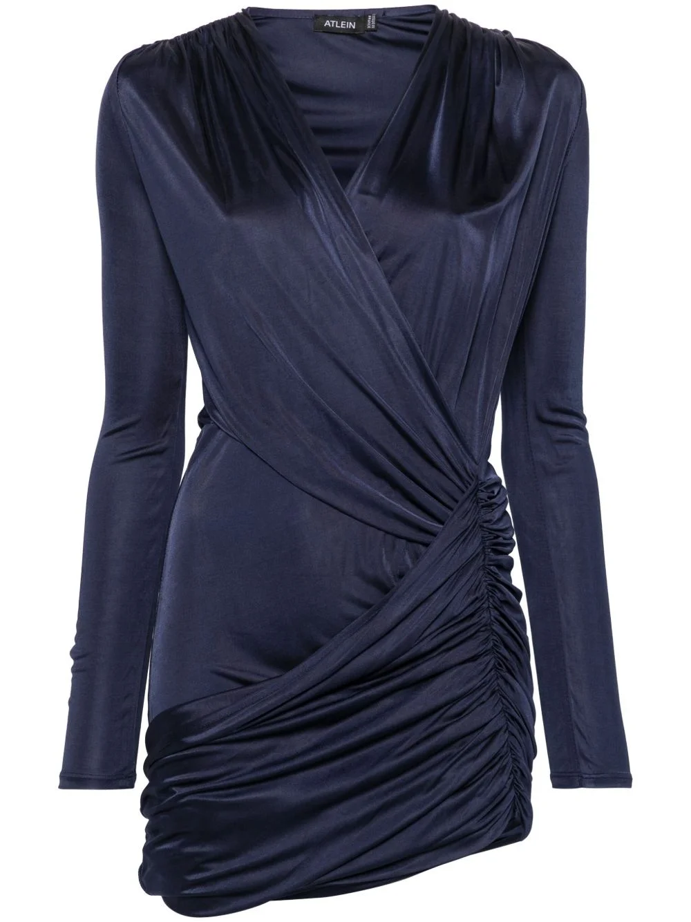 asymmetric mini dress Highlights - Midnight blue - Stretch-jersey - V-neck - Long sleeves - Draped detailing - Ruched detailing - Fitted waistline - Asymmetric hem Made in France Composition Viscose 100% SIZE & FIT Model measurements Height 5 ft 10 in(1.77 m) Bust/Chest 34.64 in(88 cm) Hips 35.43 in(90 cm) Waist 24.8 in(63 cm) FittingInformation Designed for a slim fit that sits just away from the body offering a close yet comfortable fit Made from a lightweight stretch fabric, this piece offers elasticity and flexibility when worn This piece fits true to size – take your usual size Washing instructions Dry Clean Only