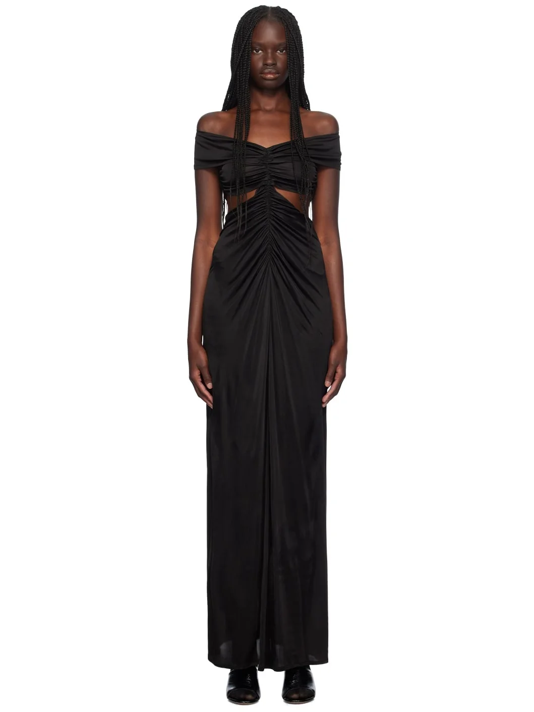 Viscose jersey dress. Ruching throughout. · Off-the-shoulder construction · Cutout at waist Supplier color: Black 100% viscose. Made in France 242302F055013
