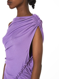 Atlein slim-fit asymmetric dress in lilac, ruched seam trim along shoulder and bodice, narrow bateau neckline, cinched scalloped hem, tonal stitching. Mad in France. Composition - 95% Viscose, 5% Elastane; 100% Viscose (Fabric 2) Model wears a size 36.
