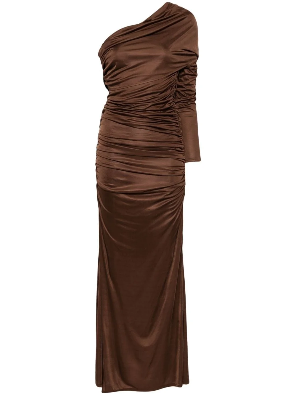single-sleeve ruched gown Highlights - Brown - Stretch-design - Draped design - Asymmetric design - Ruched detailing - Off-shoulder - Single long sleeve - Floor-length Made in France Composition Viscose 100% Washing instructions Dry Clean Only