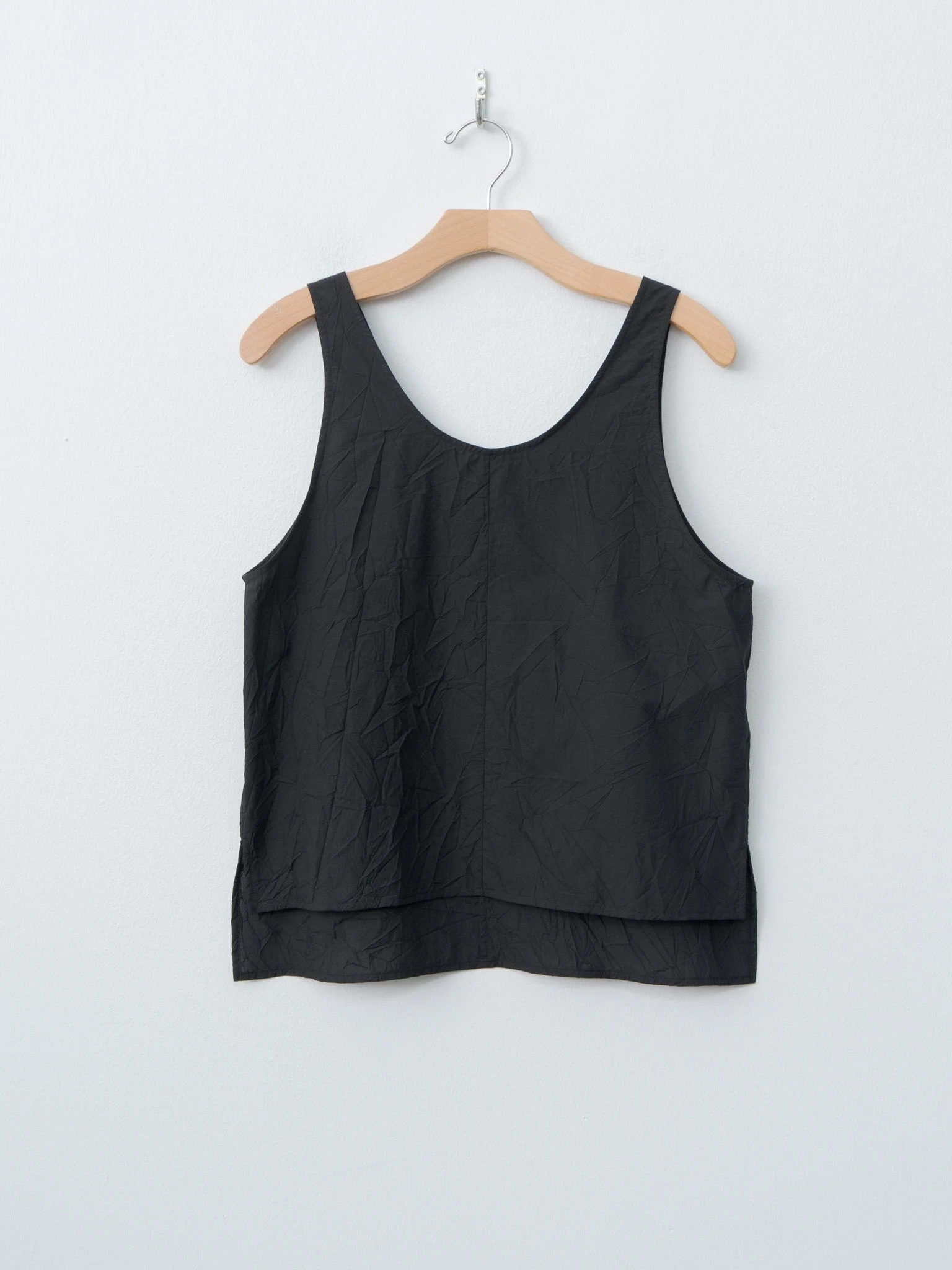 Made from ATON’s original wrinkled cotton lawn, this tank top has a crisp texture and natural wrinkling, giving it a lived-in, airy look and feel. Details include a boxy fit, wide armholes and a side split hem with a longer length in the back. - Made in Japan - 100% Cotton - Available in Black - The model is 5'7"/170cm and wears size 2/M