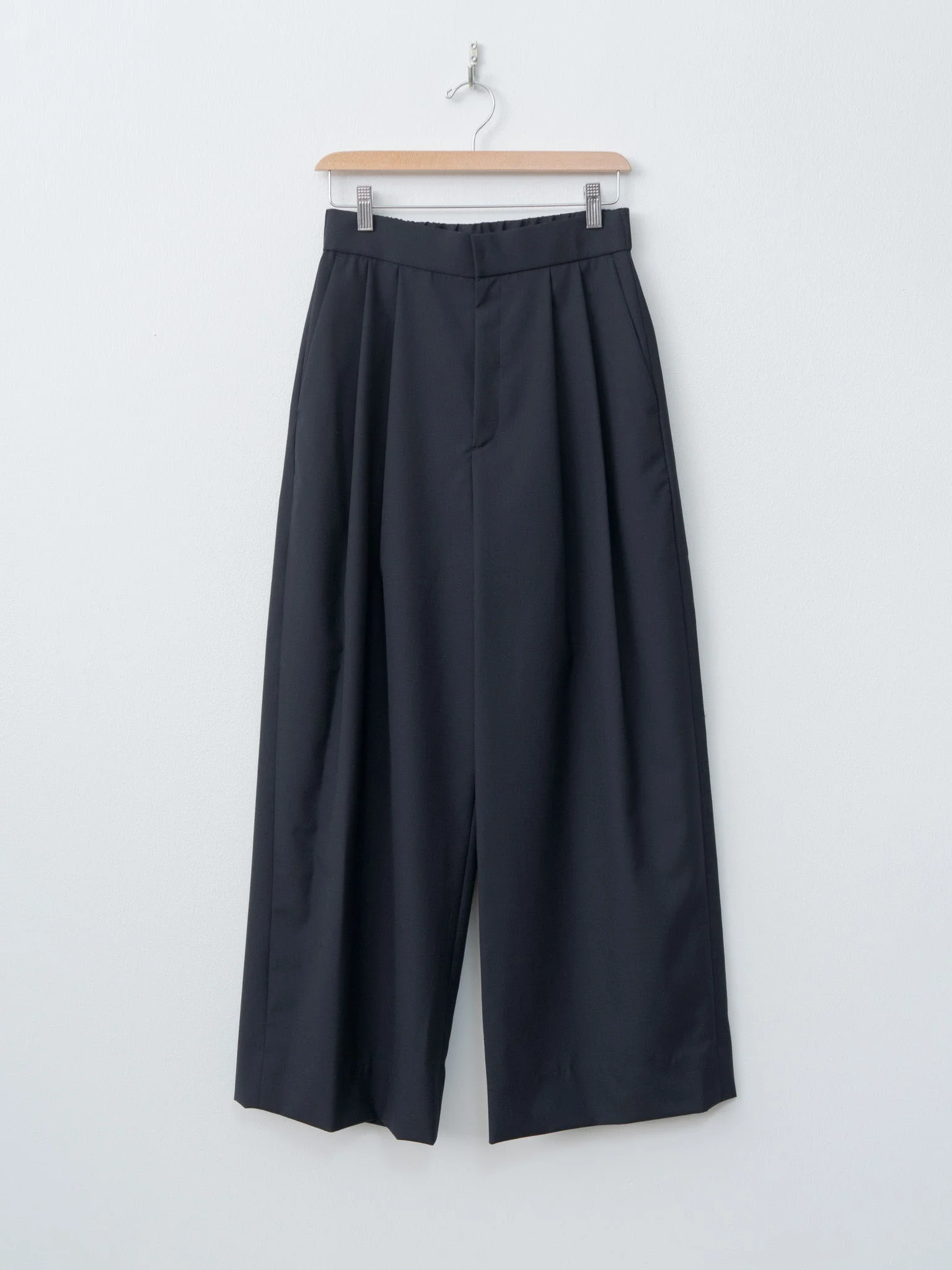 The Wool Tropical Wide Easy Pants are high-rise, two-tuck trousers with a wide, relaxed leg, crafted from lightweight wool suitable for three-season wear. Designed for comfort and ease, they feature an elasticated waistband with inner drawstrings, side pockets, and welted back pockets. - Made in Japan - 100% Wool - Available in Navy - The model is 5'7"/170cm and wears size 2/M
