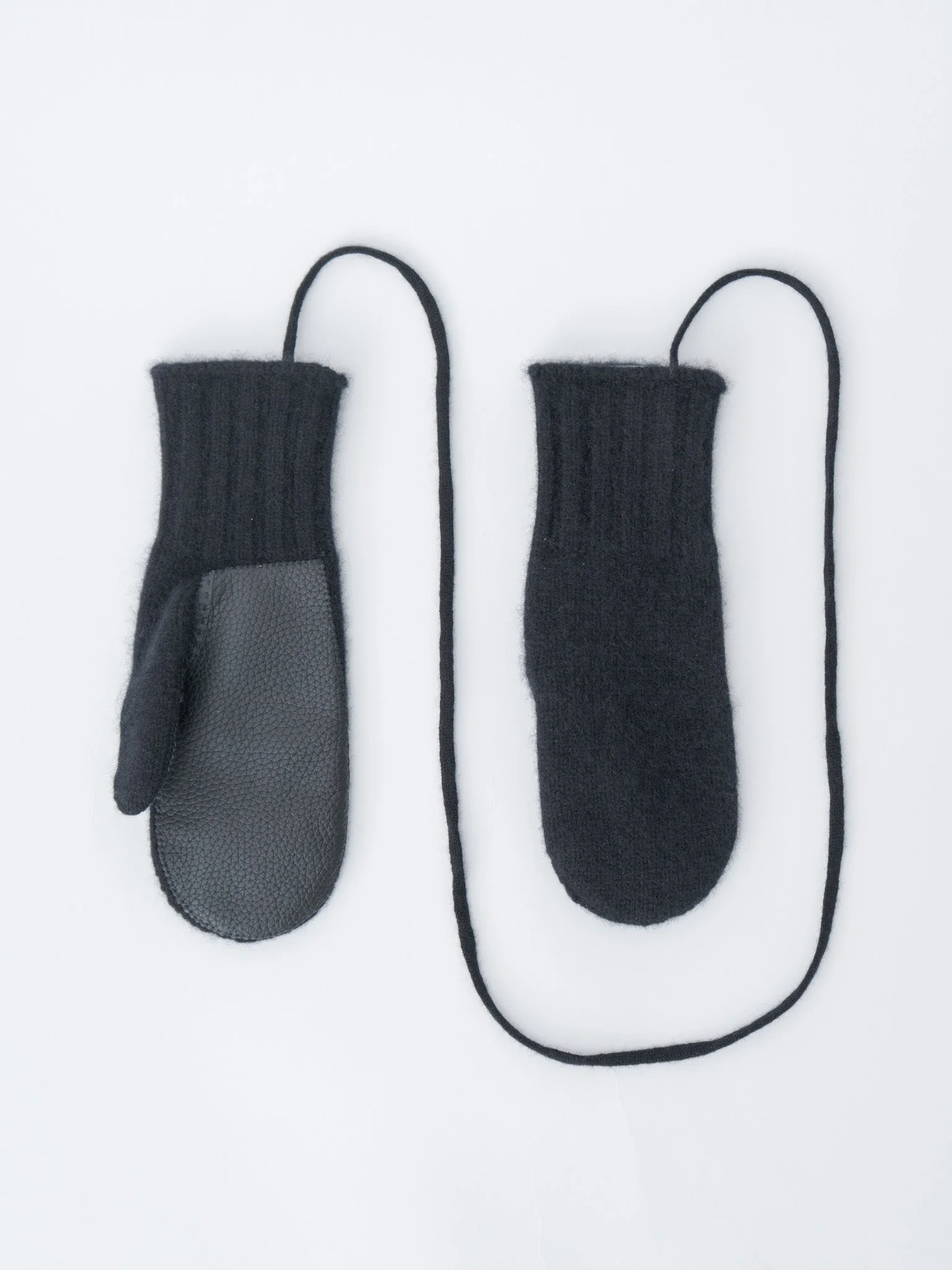 The Baby Cashmere Knit Mittens are made from rare cashmere sourced from the remote, rugged regions of Mongolia, offering a naturally soft, silky smooth texture with a beautiful luster. For the Top Black colorway, the yarn is gently dyed at low temperatures to preserve its delicate hand and reveal deep, refined tones. The design features ribbed cuffs for a secure fit, a leather palm for added durability and grip, and a long knit cord that can be looped through a coat or worn around the neck for convenience. Warm, functional, and elegantly understated. - Made in Japan - 100% Baby Cashmere - Available in Top Black - One Size - 3.9" x 6.4"