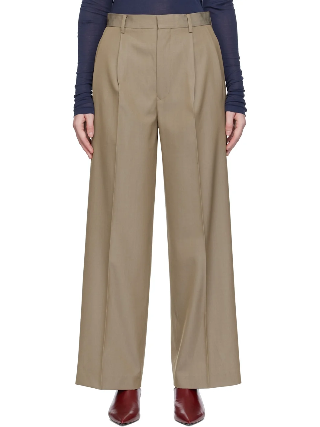 Lightweight wool gabardine trousers. · Wide-leg · Belt loops · Four-pocket styling · Zip fly · Pleats at front · Creased legs Supplier color: Khaki chambray Body: 100% wool. Lining: 100% cupro. Made in Japan 252484F087011