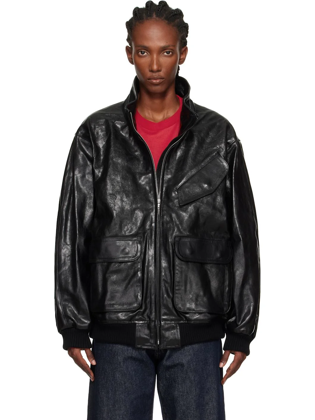 Grained lambskin jacket. · Stand collar · Zip closure · Flap pockets at front · Rib-knit hem and cuffs · Zip pocket at interior · Full satin lining Supplier color: Black Body: 100% lambskin. Trim: 90% wool, 10% nylon. Lining: 100% cupro. Made in China 252484F064000