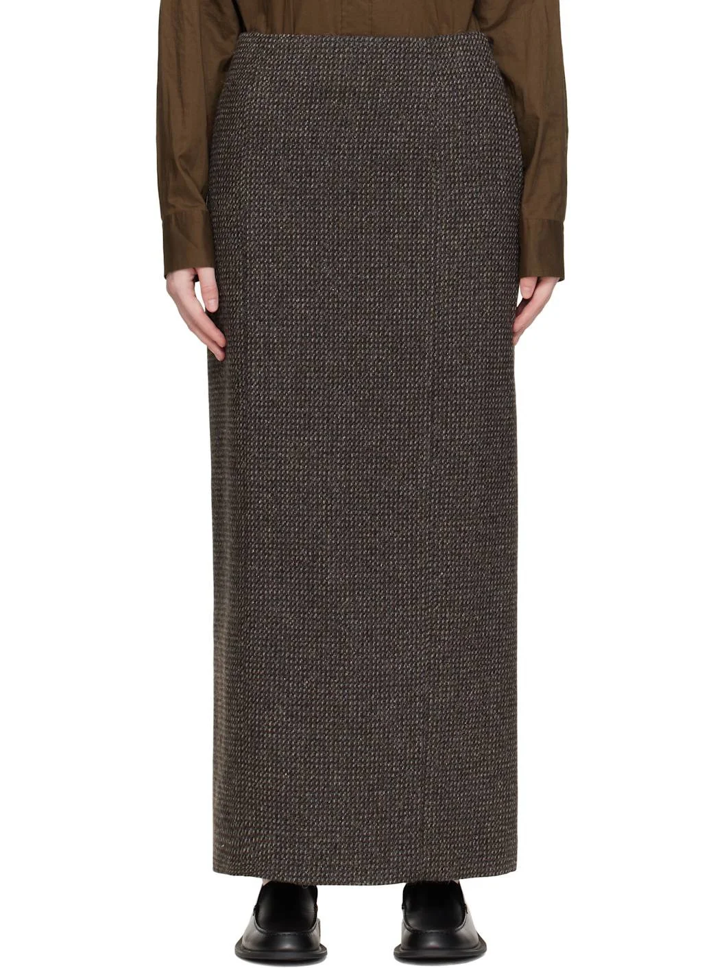 Lightweight wool- and alpaca-blend tweed maxi skirt. · Paneled construction · Two-pocket styling · Zip closure at back waist · Central vent at back hem · Full satin lining · Silver-tone hardware Supplier color: Gray brown hairline Body: 60% wool, 25% alpaca, 15% silk. Lining: 100% cupro. Made in Japan 252484F093000