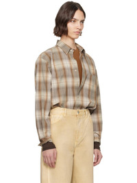 Super 120s wool oxford cloth shirt. Check pattern throughout. · Spread collar · Button closure · Patch pocket at chest · Droptail hem · Buttoned barrel cuffs · Twin pleats at back yoke · Mother-of-pearl hardware Supplier color: Gray brown check 100% wool. Made in Japan 252484F109003