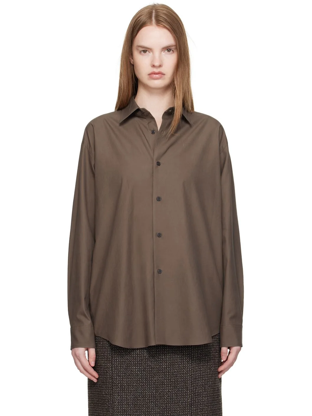 Washed cotton twill shirt. · Spread collar · Button closure · Shirttail hem · Buttoned barrel cuffs · Twin pleats at back yoke Supplier color: Brown 100% cotton. Made in Japan 252484F109011