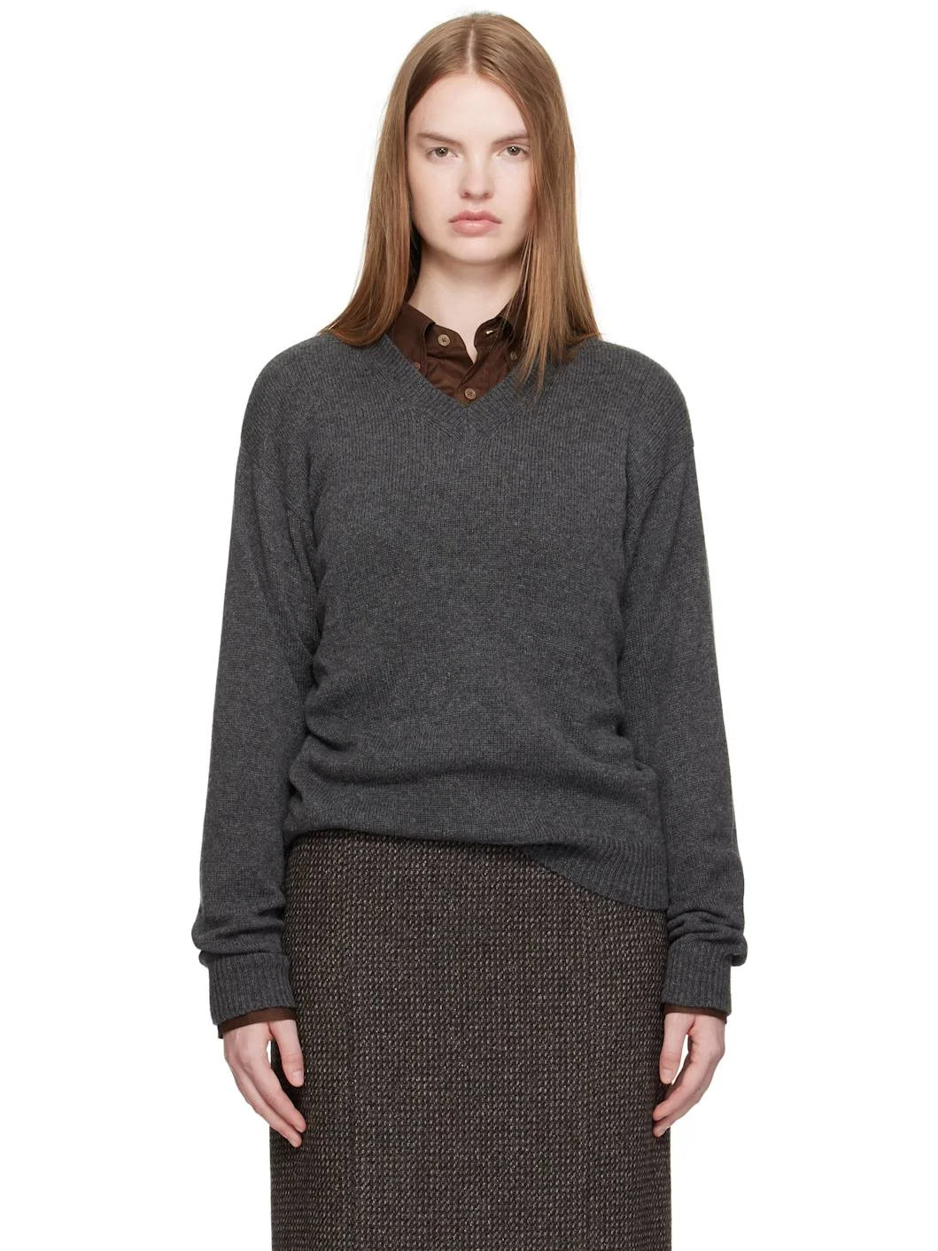 Lightweight knit cashmere sweater. · Rib-knit V-neck, hem, and cuffs · Dropped shoulders Supplier color: Charcoal 100% cashmere. Made in Japan 252484F100002