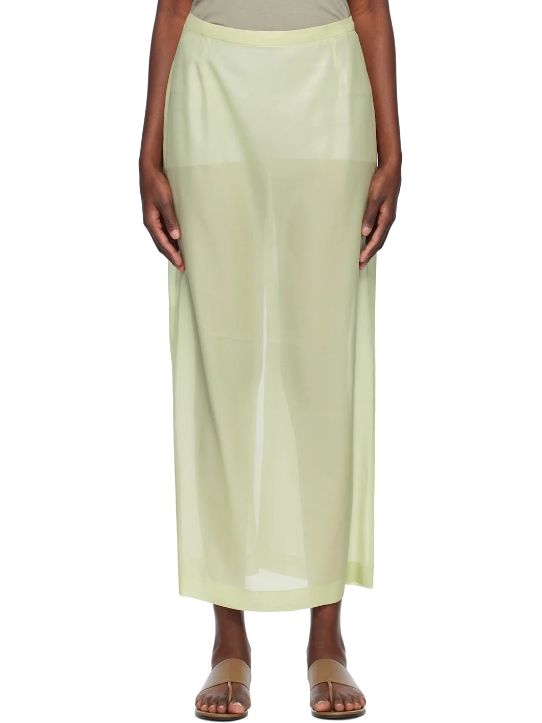 Foil-coated silk lawn cloth maxi skirt. · Semi-sheer · Darts at waist · Zip closure and slit at back Supplier color: Pale green 100% silk. Made in Japan 251484F093002