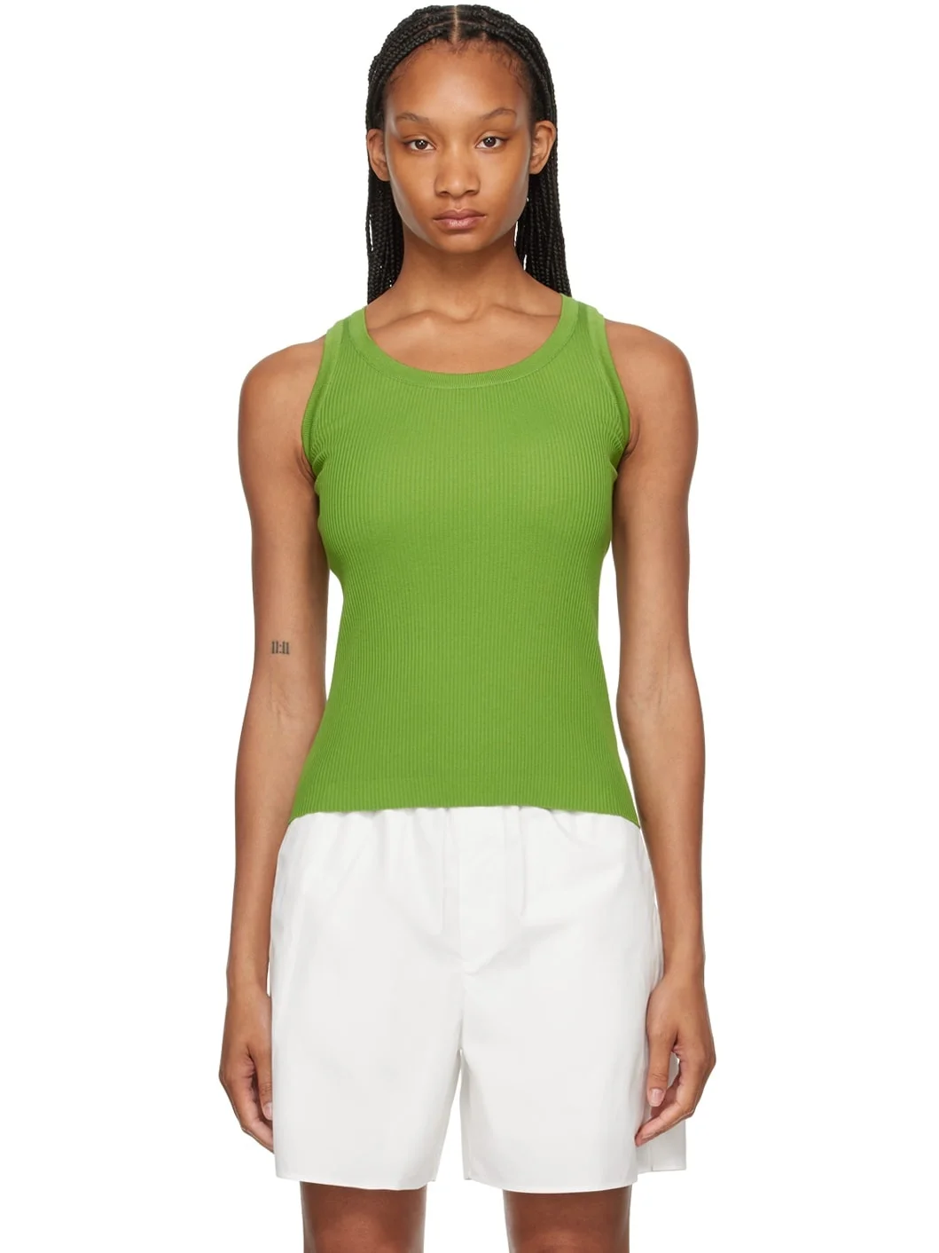 20 gauge rib knit giza cotton tank top. · Scoop neck · Droptail hem Supplier color: Green 100% cotton. Made in Japan 242484F111006