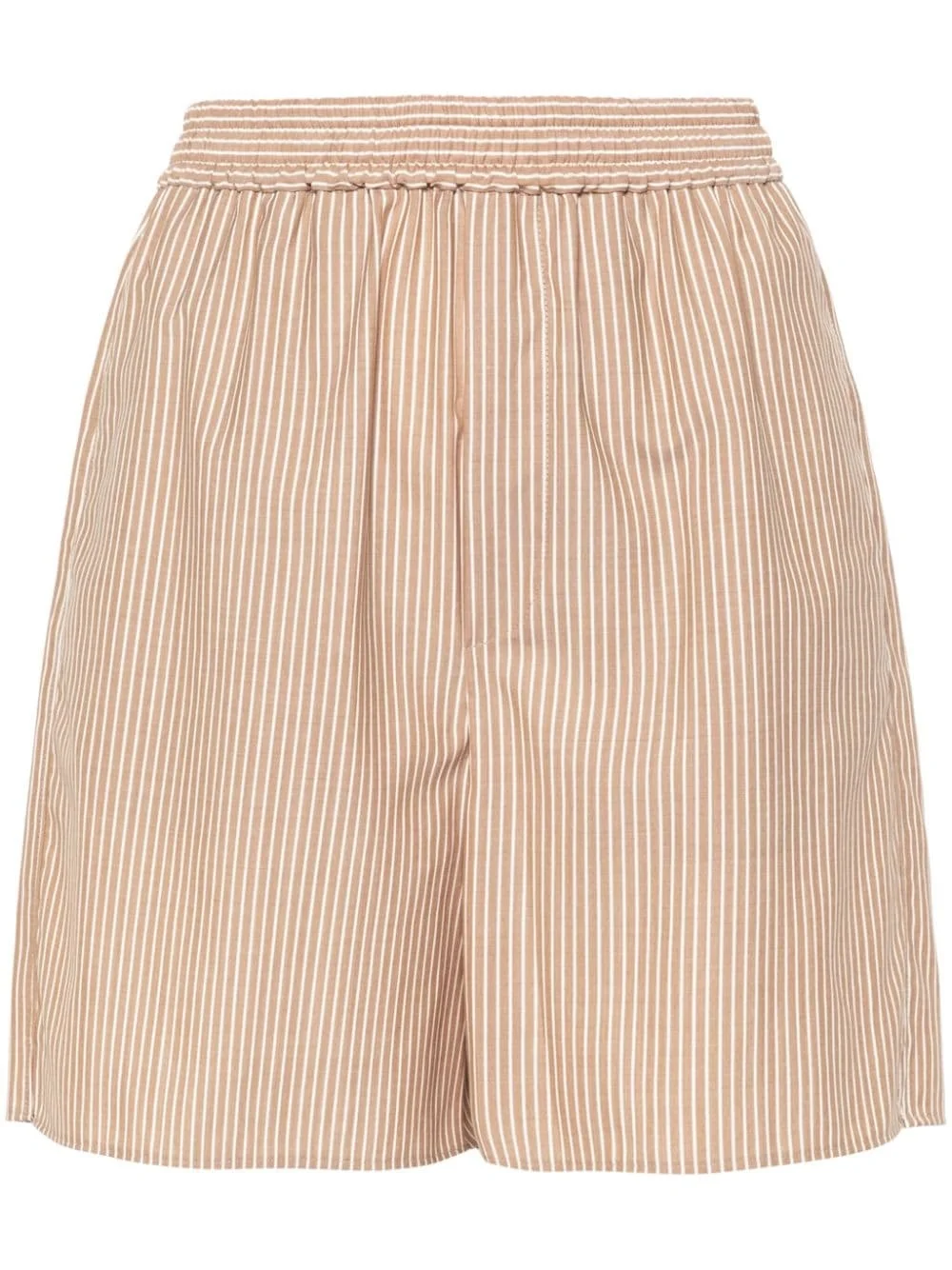 striped wool shorts Highlights - Light brown/white - Wool - Vertical stripe pattern - Two side inset pockets - Short side slits - Thigh-length - Elasticated waistband with internal drawstring Imported Composition Wool 100% SIZE & FIT Model measurements Height 5 ft 9 in(1.75 m) Bust/Chest 31.1 in(79 cm) Hips 36.22 in(92 cm) Waist 25.19 in(64 cm) FittingInformation Designed for a relaxed, roomy fit The elasticated waist allows for a comfortable fit Made from a lightweight non-stretch fabric This piece fits true to size – take your usual size